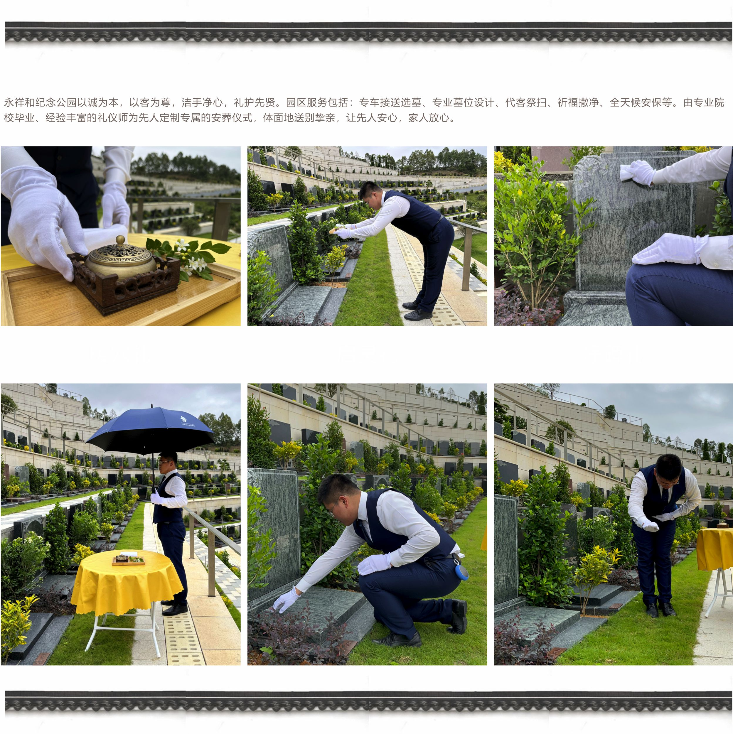 永祥和纪念公园以诚为本,以客为尊,洁手净心,礼护先资,园区服务包括:专车接送选墓、专业墓位设计、代客祭扫、祈福撒净、全天候安保等,由专业院校毕业、经验丰富的礼仪师为先人定制专属的安葬仪式,体面地送别挚亲,让先人安心,家人放心,